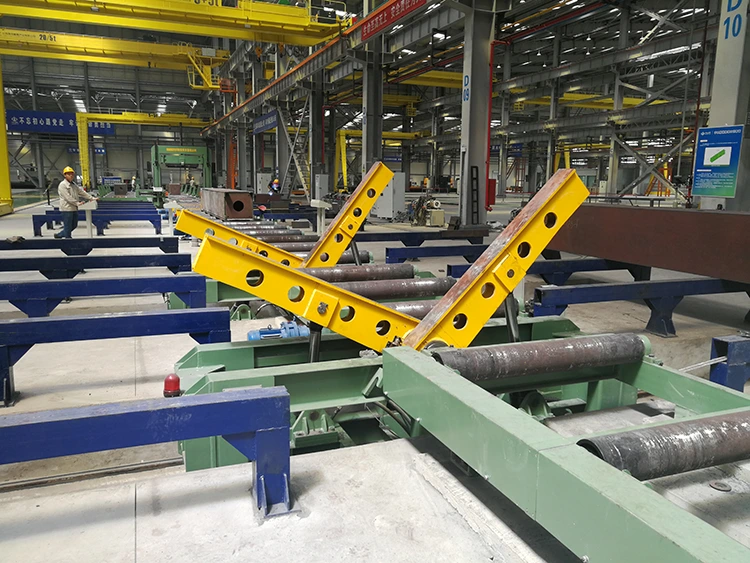 Soláthraítear dhá ríomhaire de chumhróirí bíoma hiodrálacha sochorraithe i ngach tacar, a úsáidtear go príomha chun ró -chasadh a dhéanamh ar phíosaí oibre tar éis iad a tháthú ar thaobh amháin. Nuair a bhíonn tú ag obair, tóg an phíosa oibre ar shiúl ón mbord sorcóir nó ón raca oibre, agus spreagann an reducer an dá lúibín ar ais chun gluaiseacht go sioncronach chun an phíosa oibre a bhogadh go taobh an bhoird sorcóra nó an raca oibre. Ansin, tiomáint dhá shorcóir hiodrálacha an dá arm L-chruthach chun rothlú go sioncronach. Tar éis an phíosa oibre a chur ar ceal, aistrítear é go lár an bhoird sorcóra nó an raca oibre, agus ansin iompraítear an phíosa oibre go dtí an chéad phróiseas eile nó táthaithe.